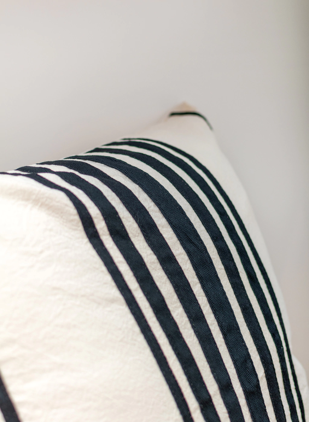 Almohadón confeccionado en tusor de algodón color natural y ribete negro, suma estilo con un diseño relajado y sofisticado a la vez a tus espacios.