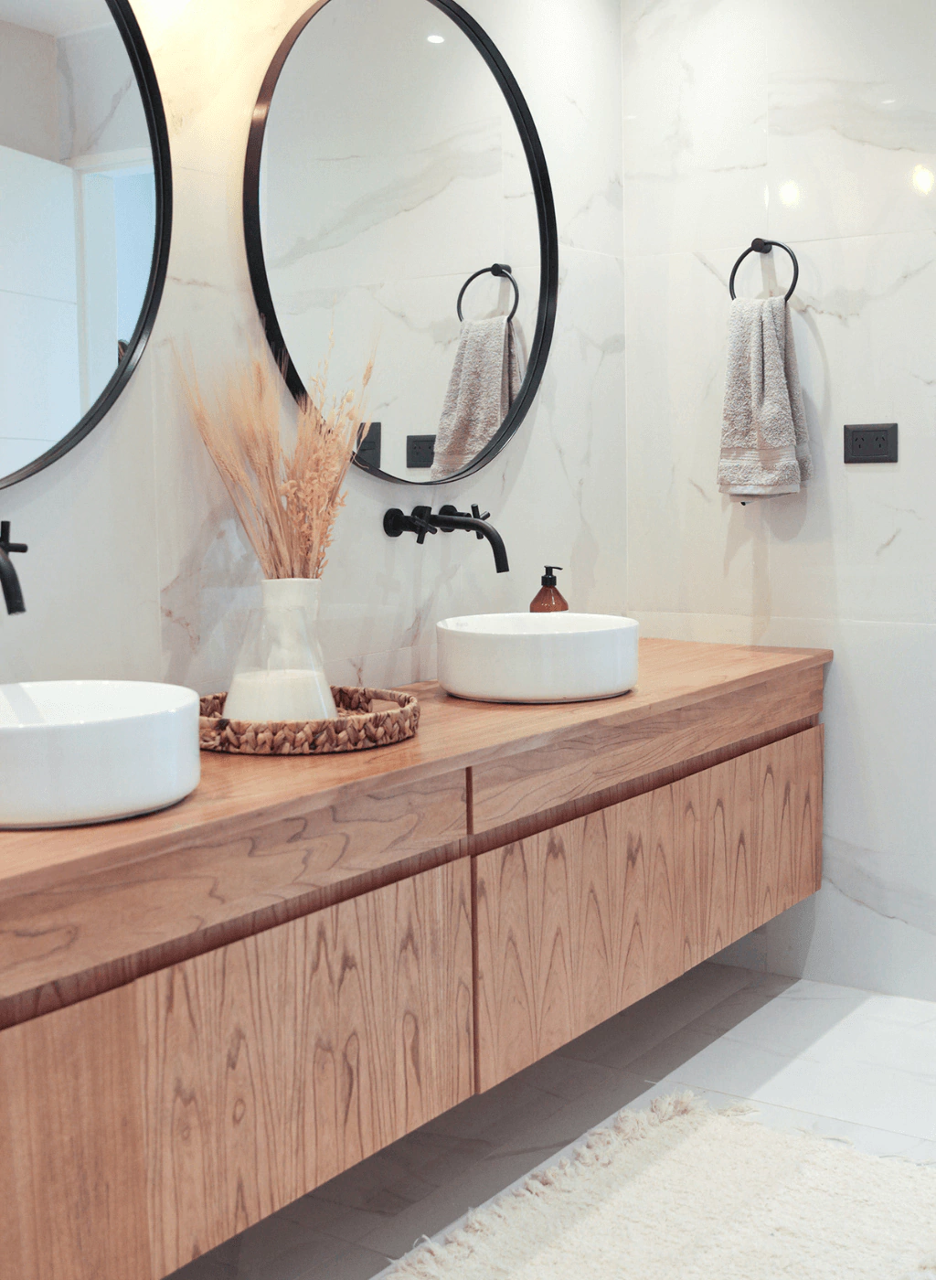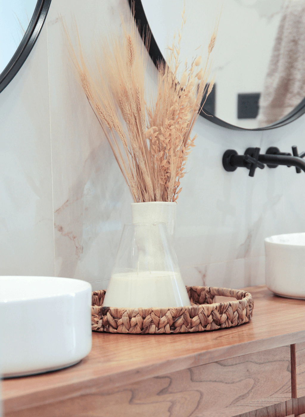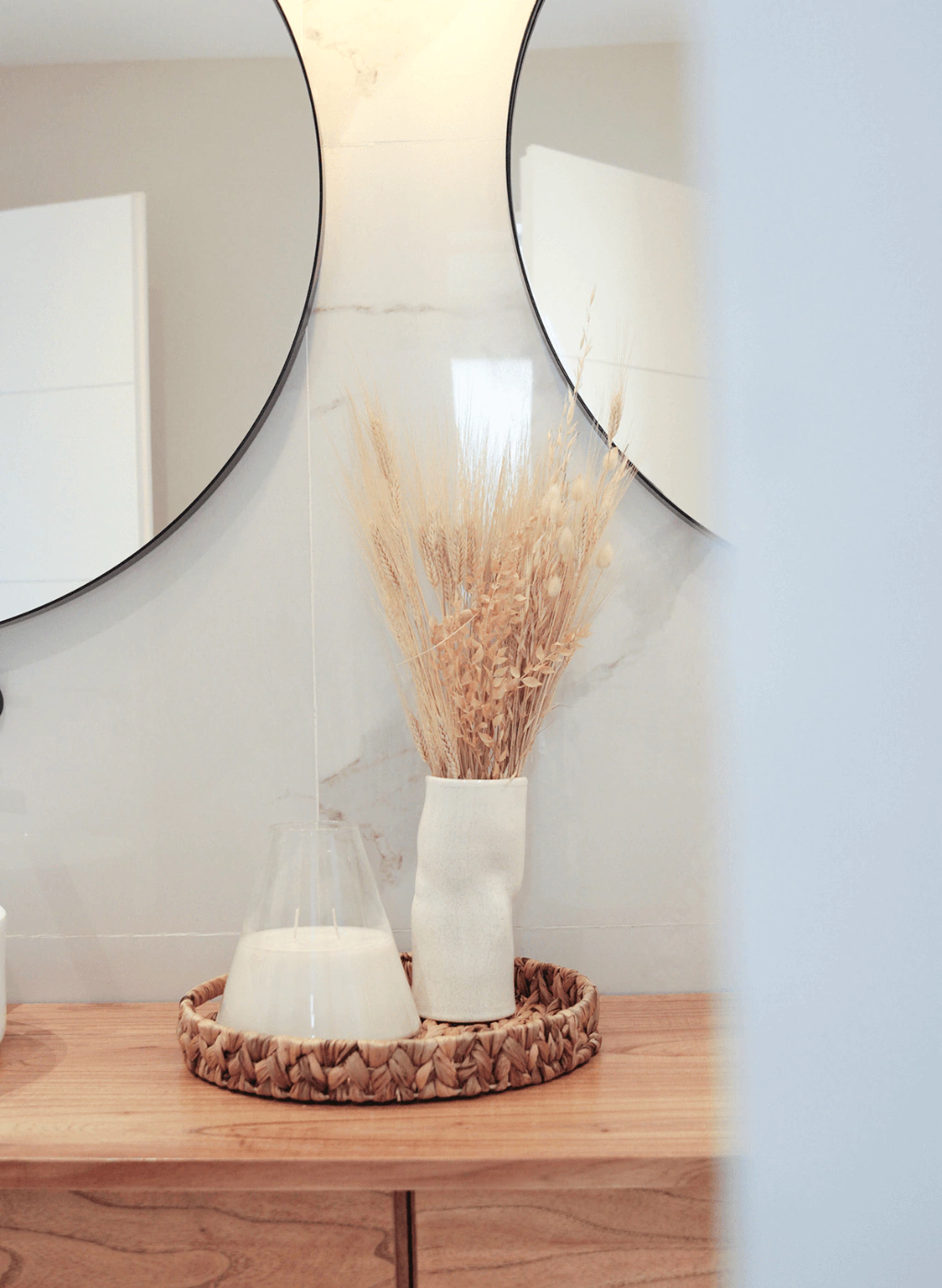 Bandeja redonda de seagrass con manijas.