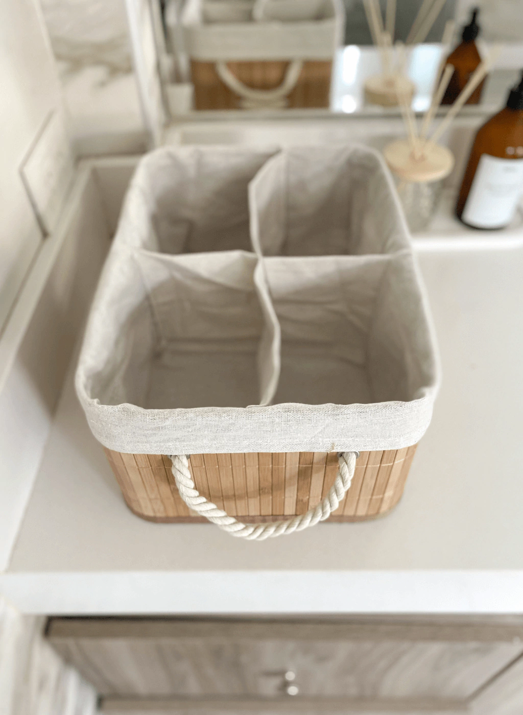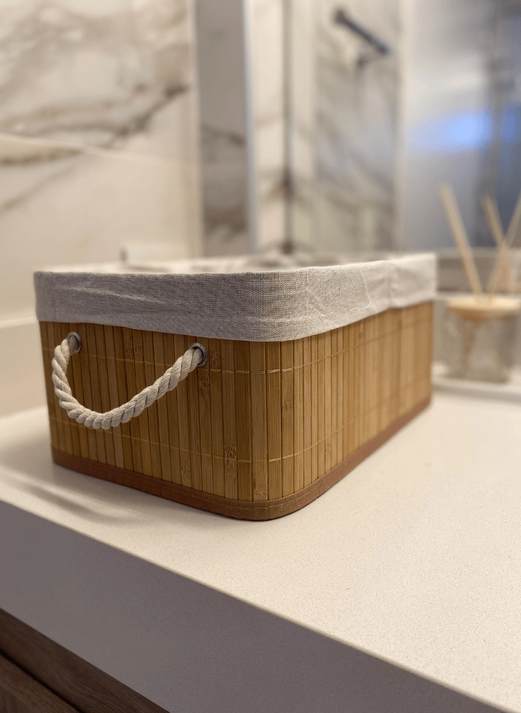 Canasto rígido organizador de bambú y lienzo con dos manijas de soga.