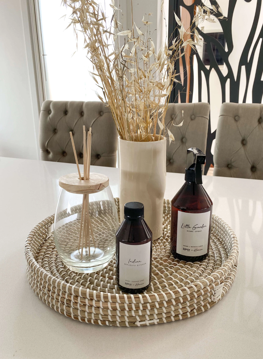 El combo incluye 1 copón de vidrio con tapa difusora de madera, 1 repuesto de difusor de 250ml aroma a elección y un set de 6 varillas de rattan