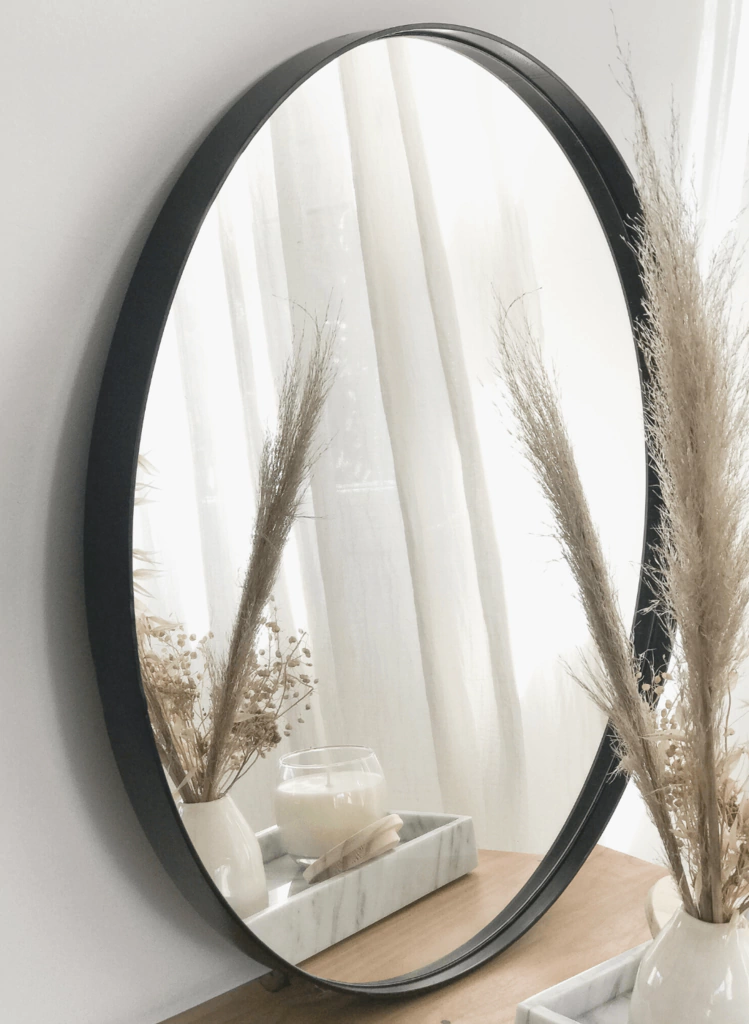Espejo redondo de 40mm de espesor con marco de hierro negro, reforzado en la parte de atras con estructura de hierro para evitar la separación del espejo y marco. Viene en diferentes tramaños y listo para colgar o apoyar.