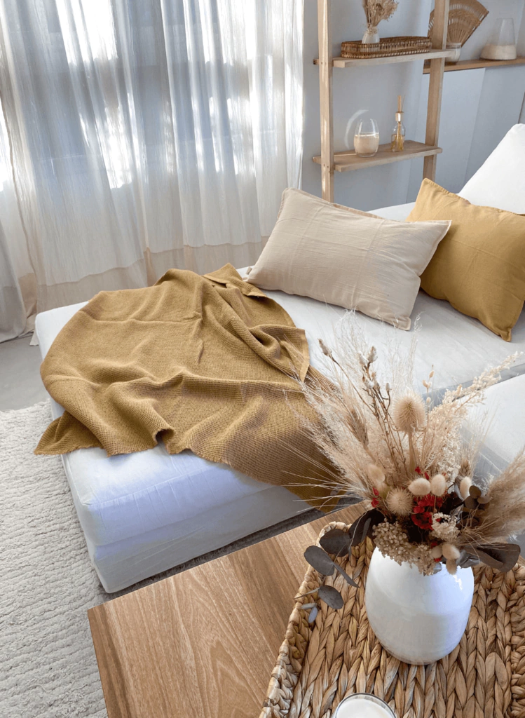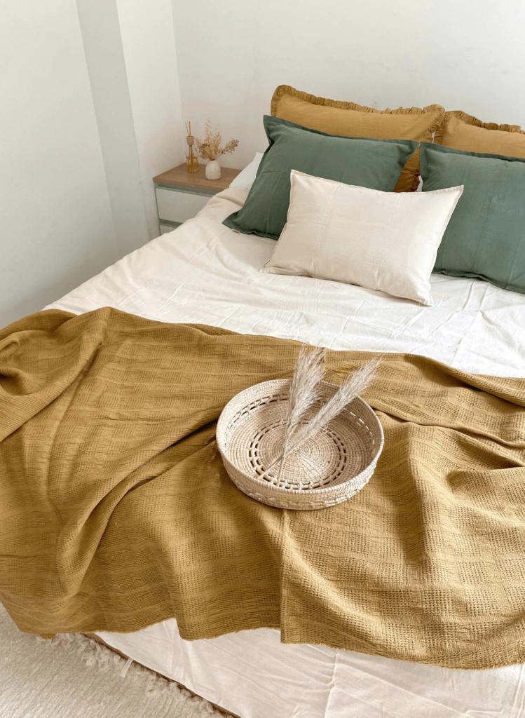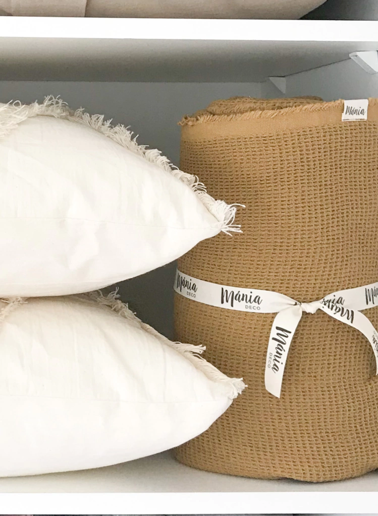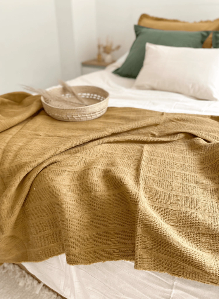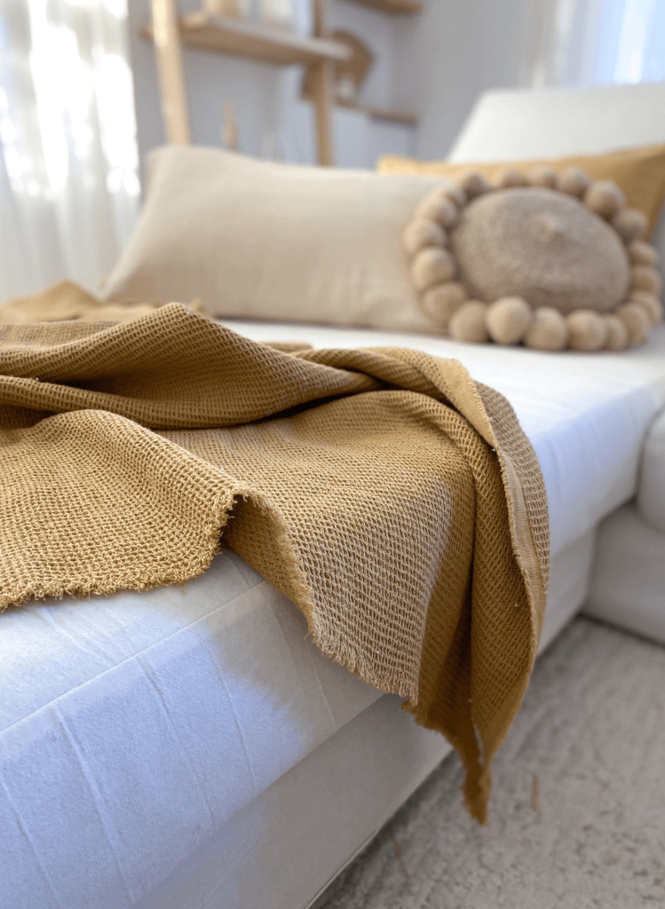 Confeccionada con waffle 100% de algodón, terminación desflecada ideal para usar como pie de cama o para decorar el sillón.