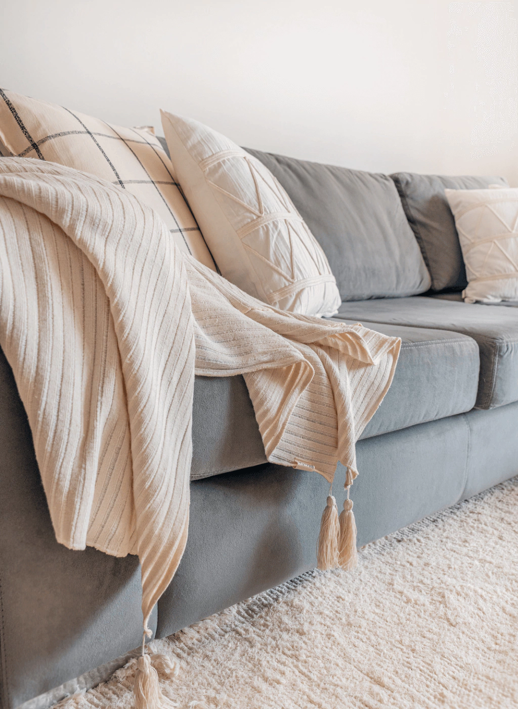 Manta tejida de algodón con 4 borlas en cada extremo, ideal para cubrirte en los días templados o para decorar living, dormitorio o sala de estar, dale calidez a tus espacios sumando texturas.