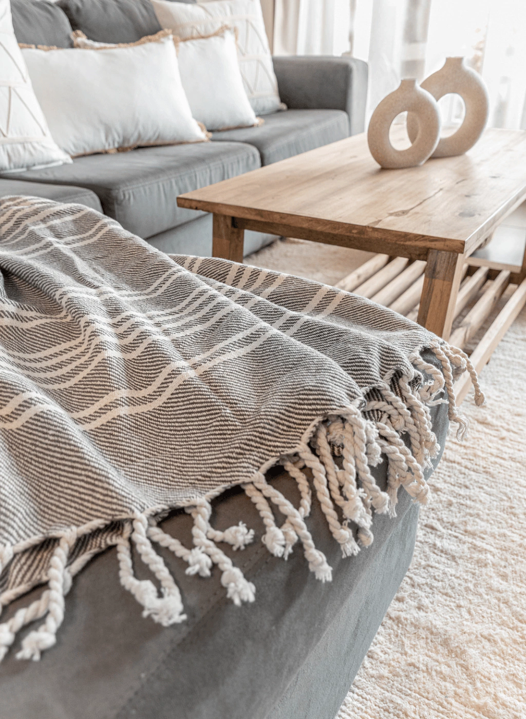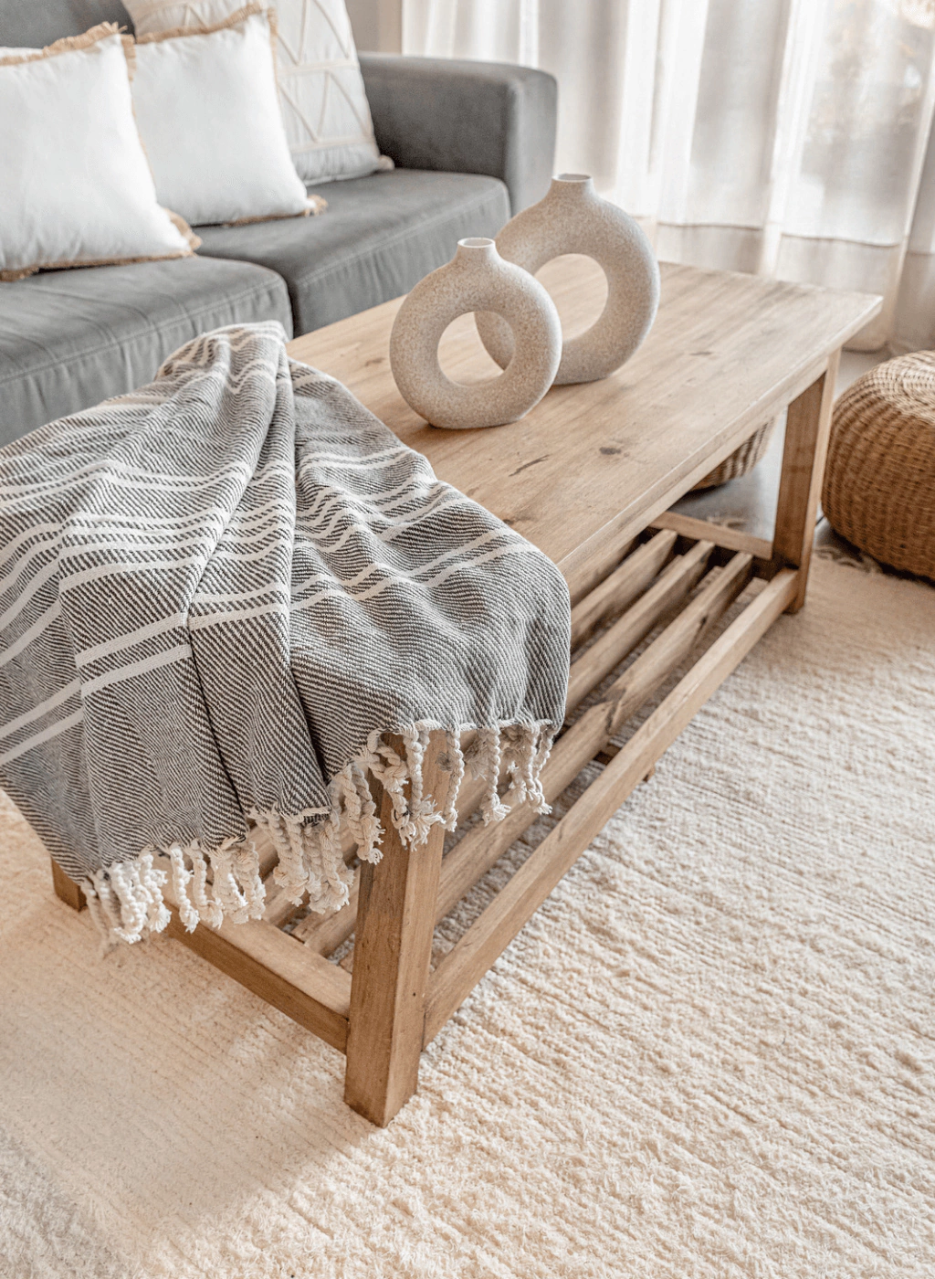 Manta de algodón con flecos en ambos extremos, ideal para decorar el sillón o el dormitorio.