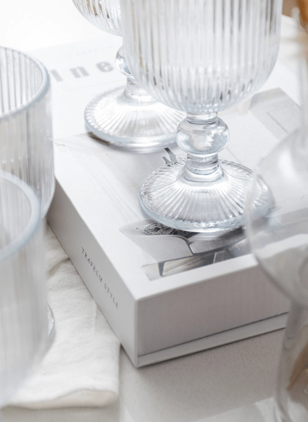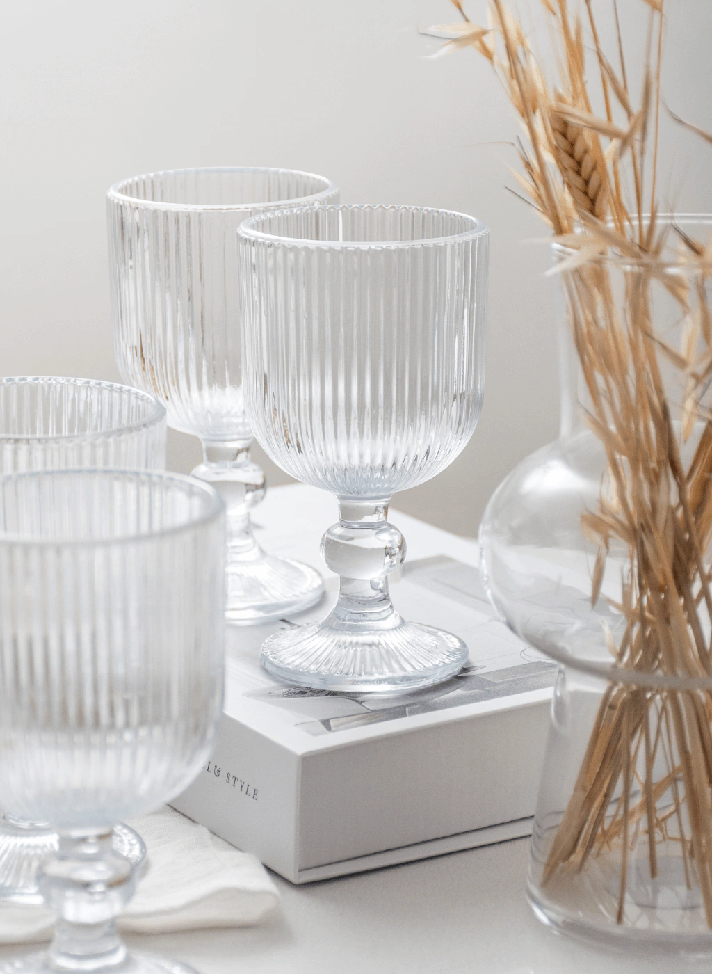 El set incluye 6 copas labradas, un complemento elegante y sofisticado para tus momentos especiales. Cada copa presenta un diseño detallado que aporta un toque de distinción a tu mesa.