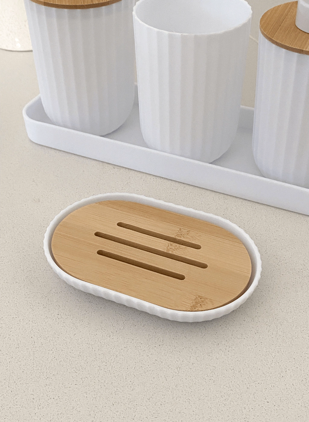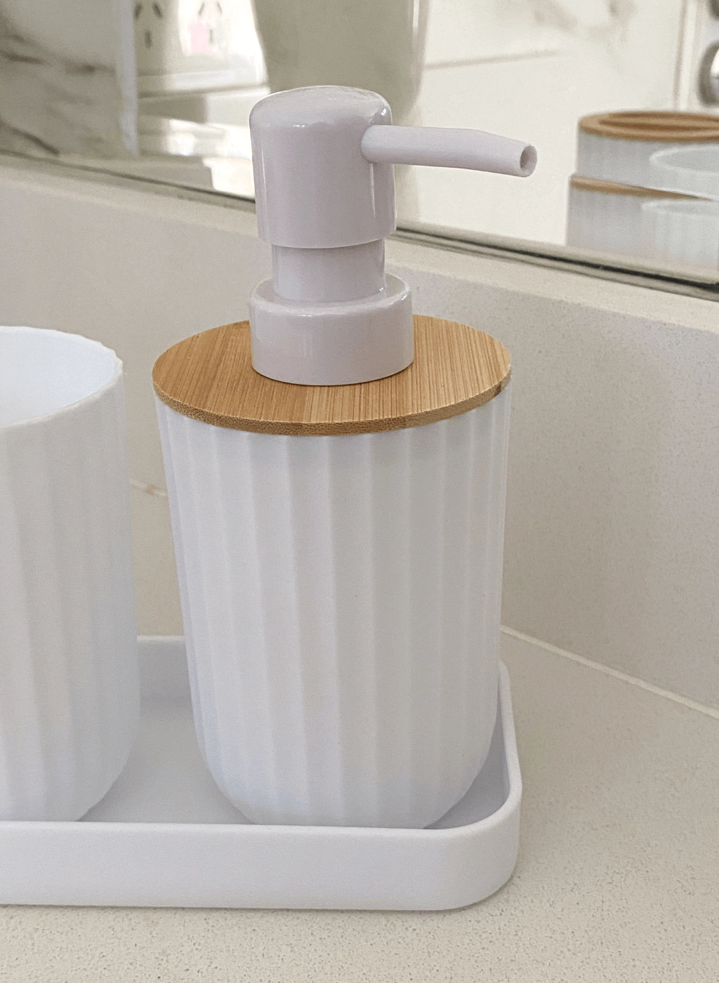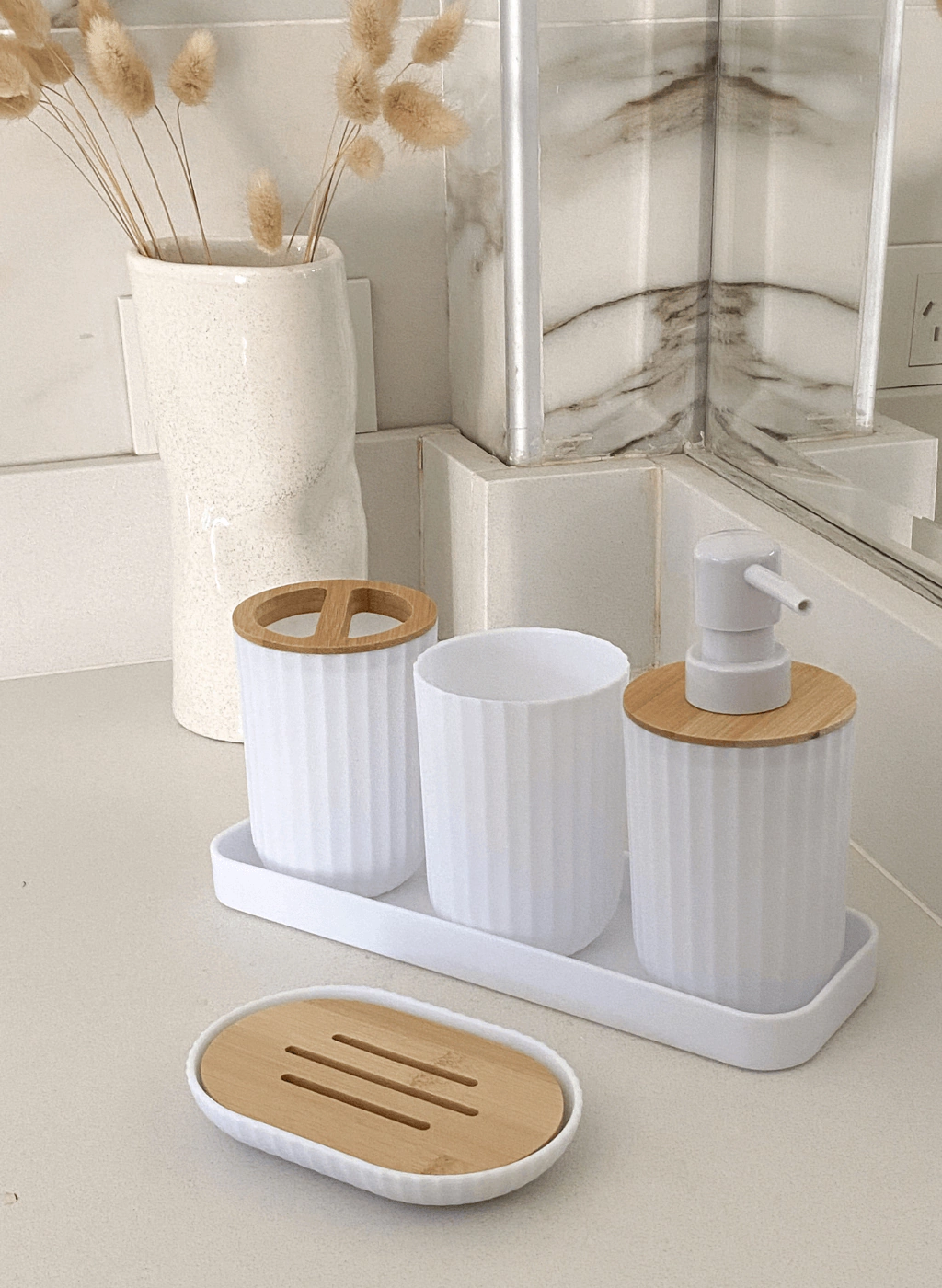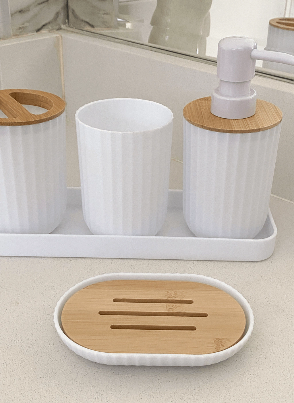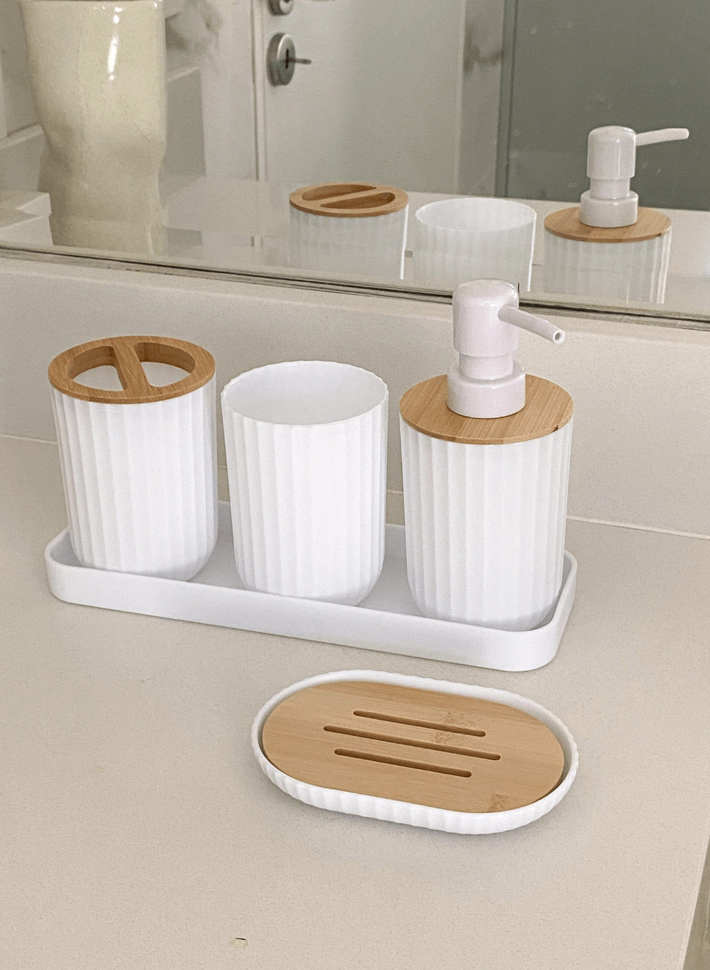 1 Dispenser + 1 Porta cepillo + 1 Contendor + 1 Jabonera + Bandeja organizadora. No se venden las piezas por separado.