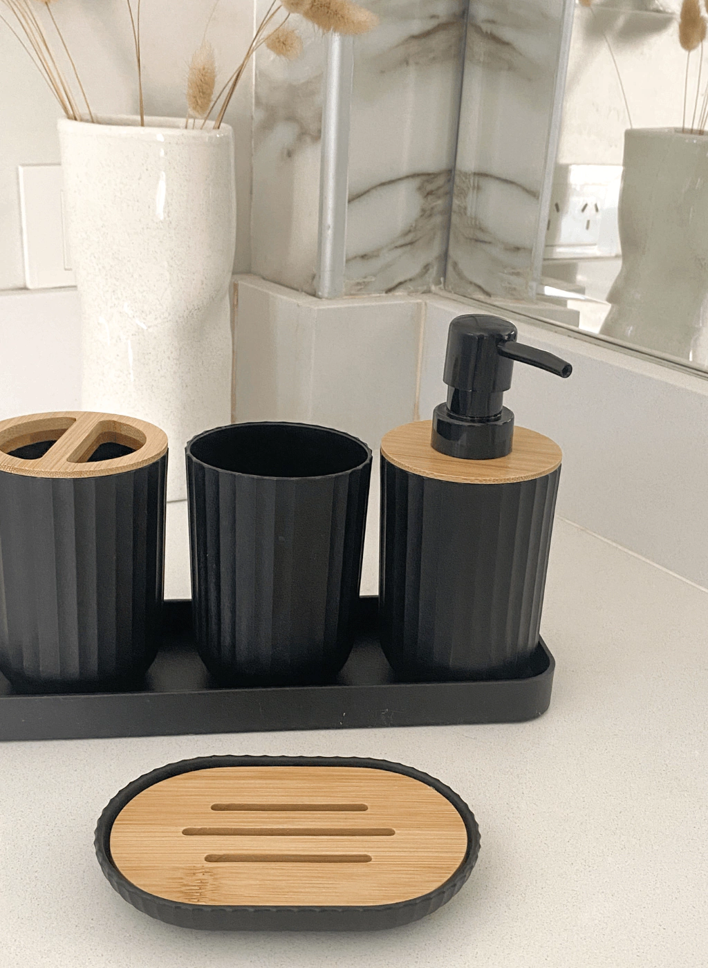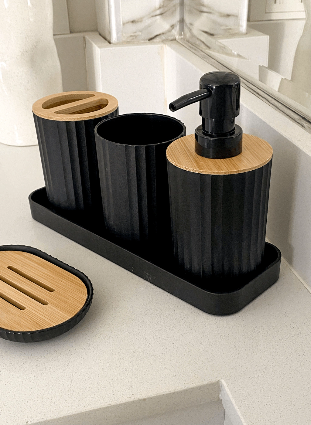 1 Dispenser + 1 Porta cepillo + 1 Contendor + 1 Jabonera + Bandeja organizadora. No se venden las piezas por separado.